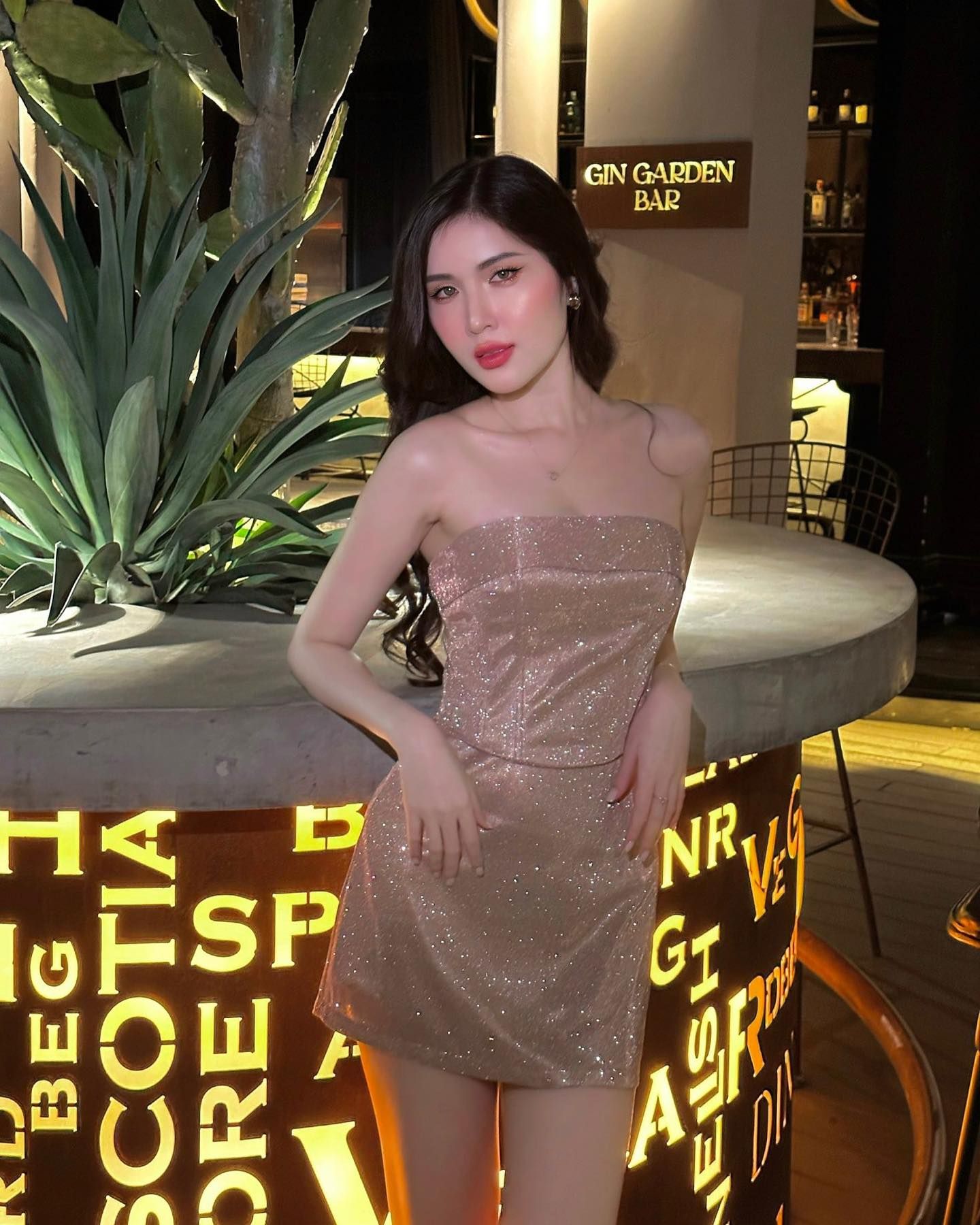- Chất liệu nhũ ép lụa cao cấp, vải óng ánh và có độ co giãn nhẹ. Gồm áo corset và váy ngắn form chữ A.