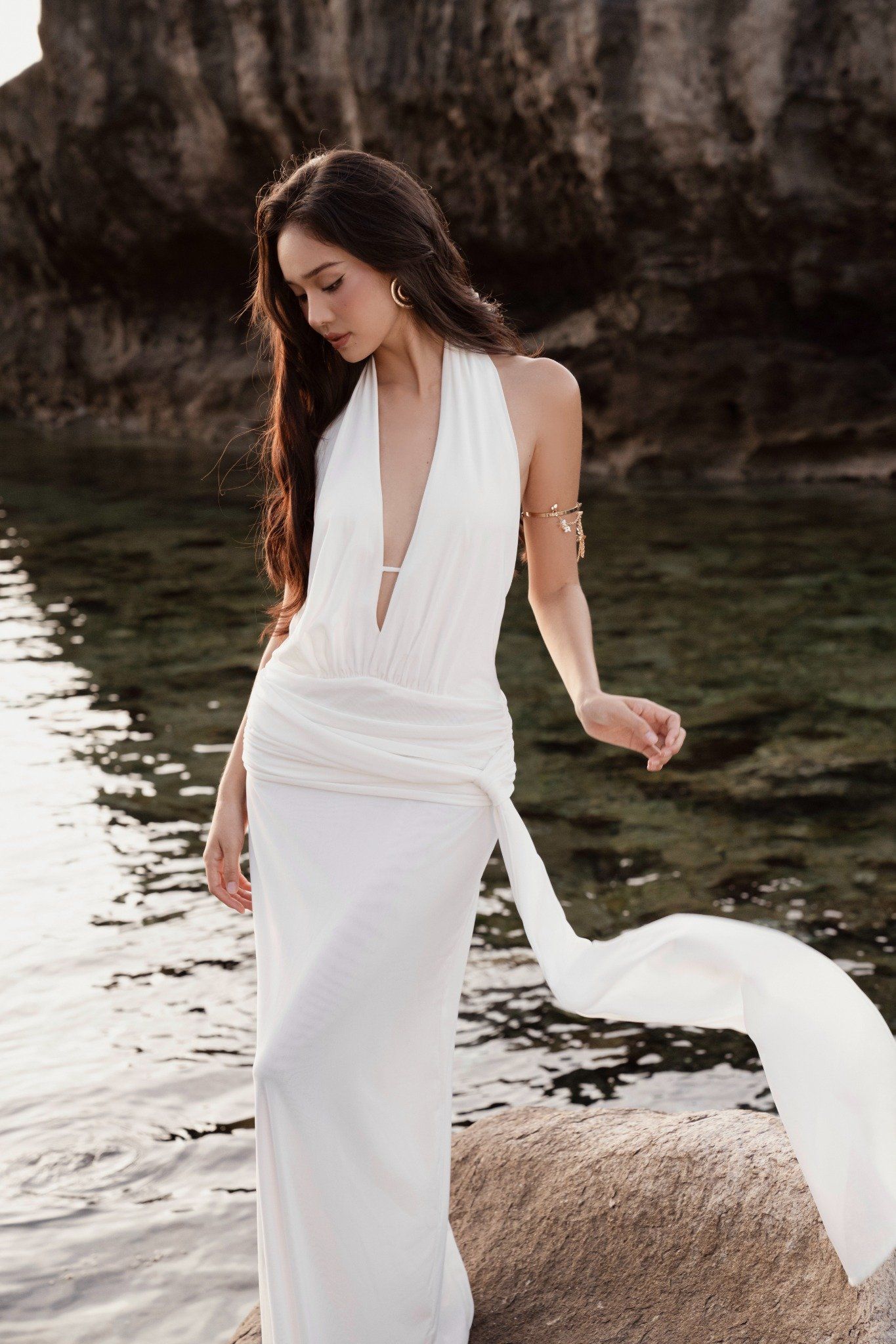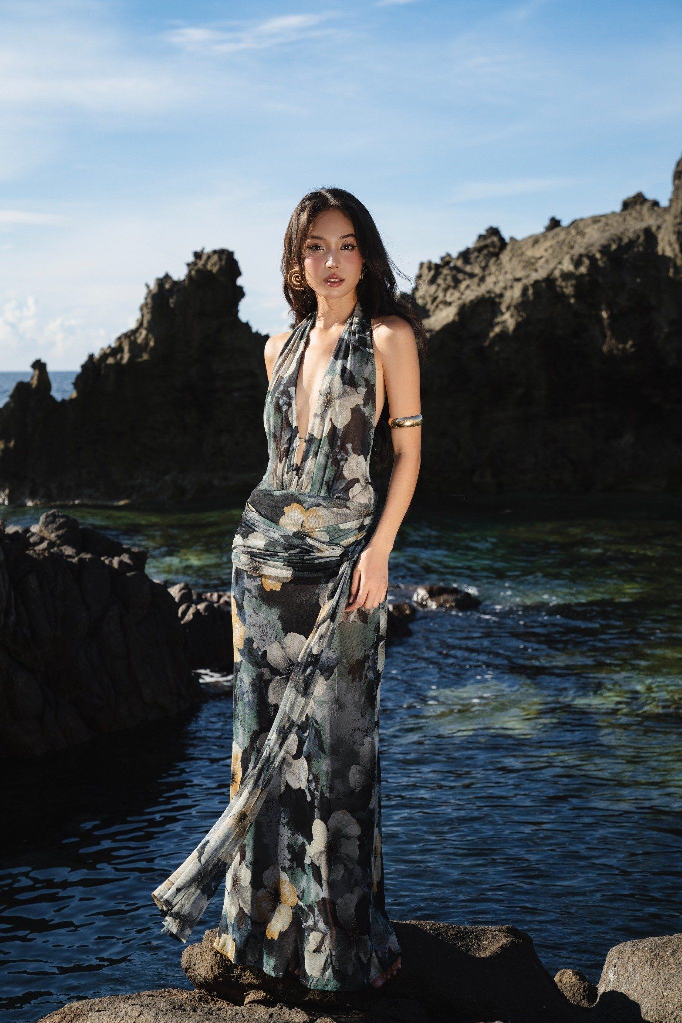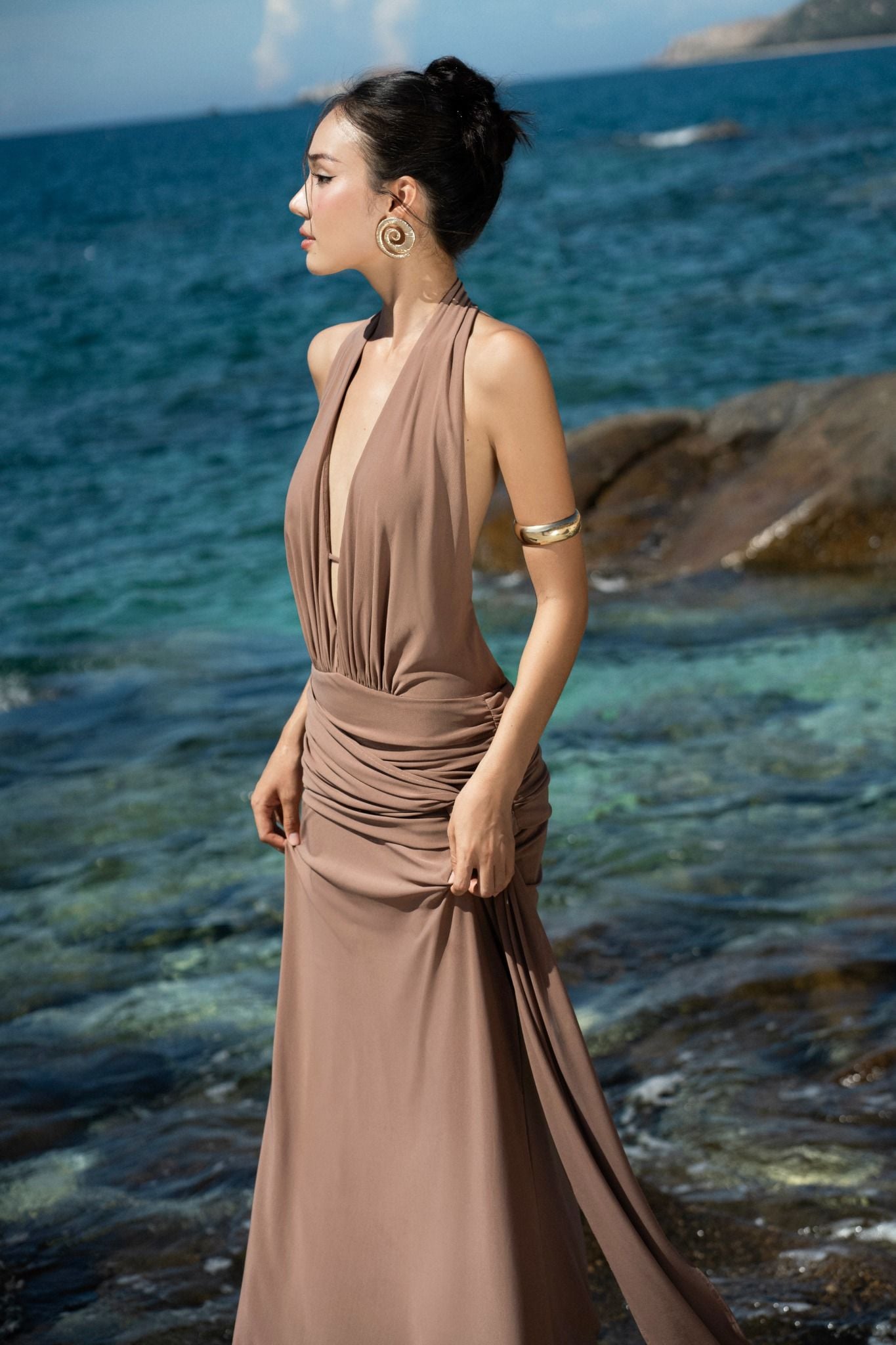 Thiết kế hở lưng đầy mê hoặc, chất vải rũ nhẹ ôm dáng quyến rũ. Màu sắt trầm thanh lịch – lý tưởng cho tiệc biển, resort hay những khoảnh khắc toả sáng trong nắng hè.