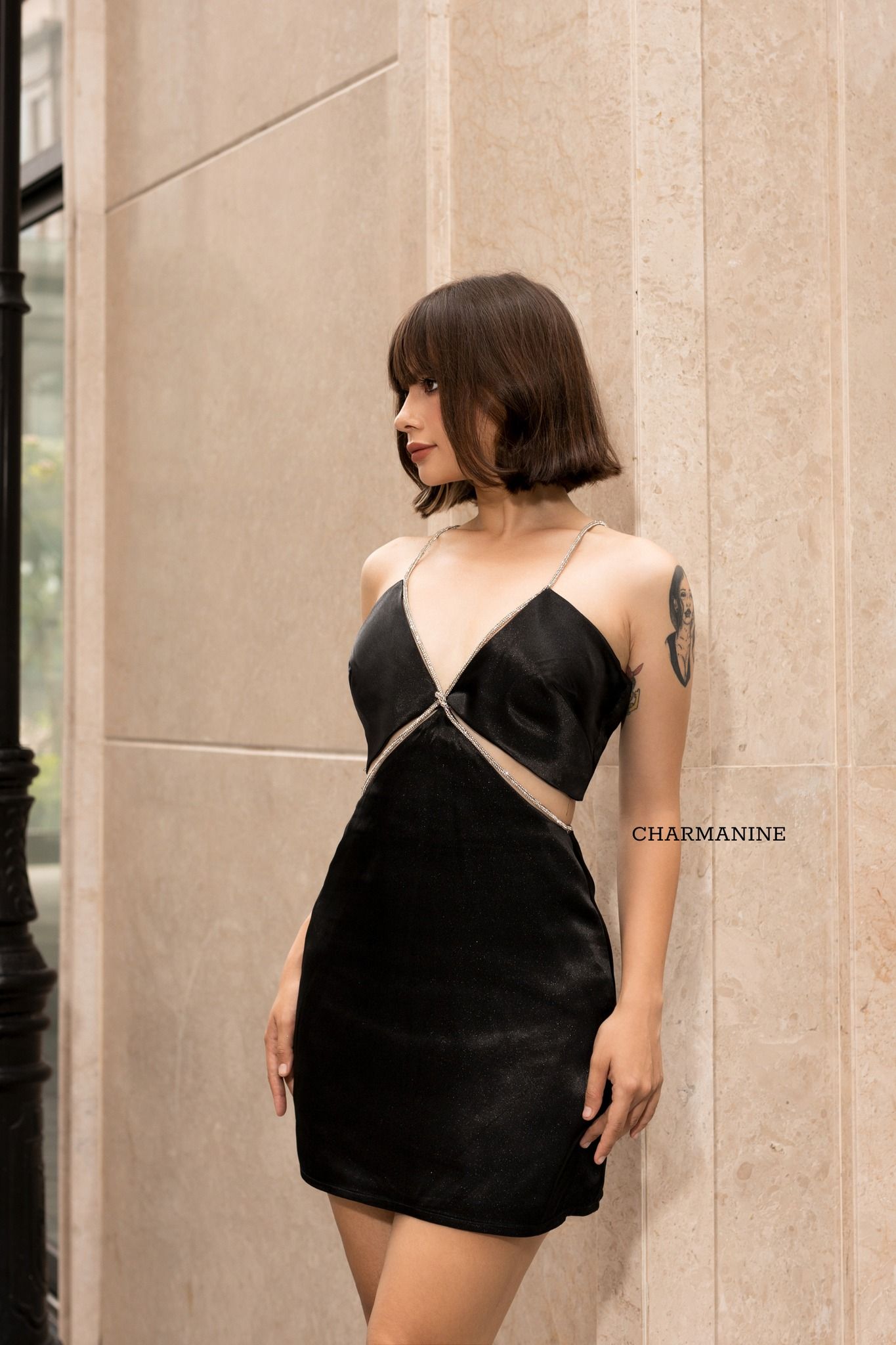 - Chất liệu từ lụa ánh nhũ, thiết kế cắt xẻ tinh tế kết hợp dây đá cao cấp.